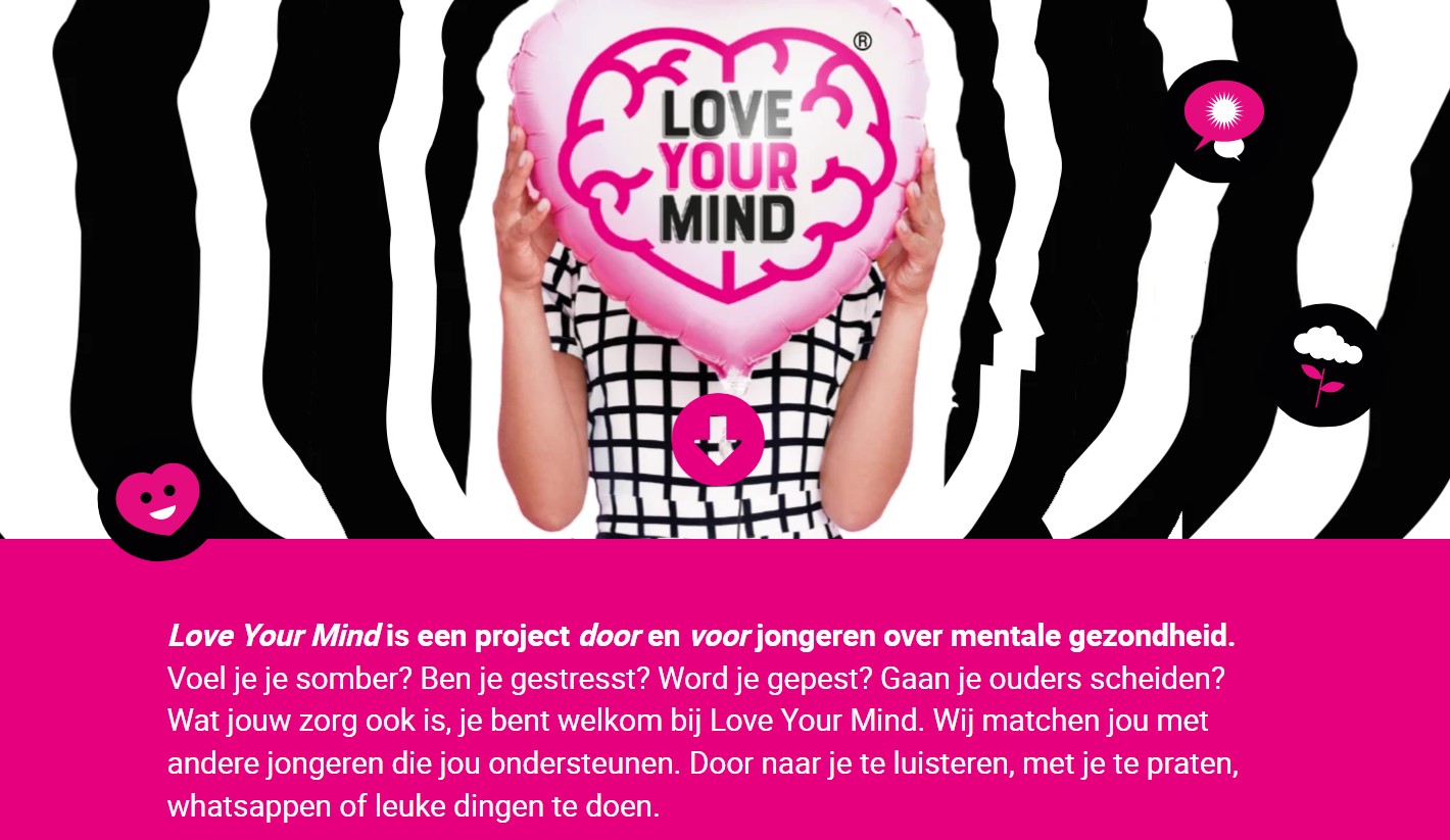 Love Your Mind is een project door en voor jongeren over mentale gezondheid. Voel je je somber? Ben je gestresst? Word je gepest? Gaan je ouders scheiden? Wat jouw zorg ook is, je bent welkom bij Love Your Mind. Wij matchen jou met andere jongeren die jou ondersteunen. Door naar je te luisteren, met je te praten, whatsappen of leuke dingen te doen.